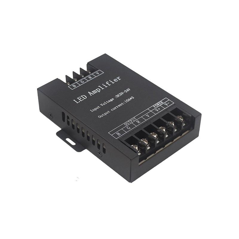 Amplifier KM-RGBA-11, 3x10A 12V/360W 24V/720W sa používa na ovládanie RGB pásov. Je riadený controllerom na ktorý je napojený. Používa sa ak nevieme odoberaný výkon LED pásov vykryť výkonovo jedným controllérom.