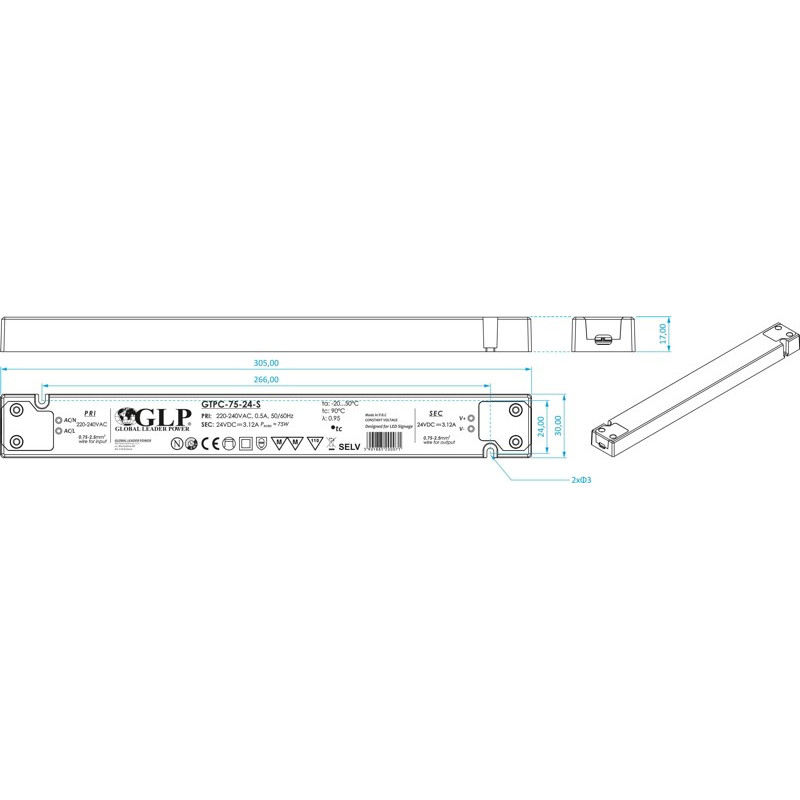 Napájací zdroj 32610075 GTPC-75-12-S, inštalačný 75W slim, s konštantným napätím 12V DC na výstupe, vhodný pre napájanie LED aplikácií