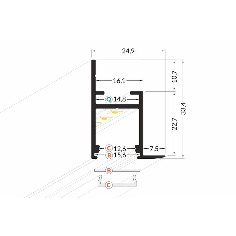 Lišta KM5-S 2M, 40050002, strieborná hliniková, určená pre podsvietenie sadrokartónov, kazetových stropov a stien