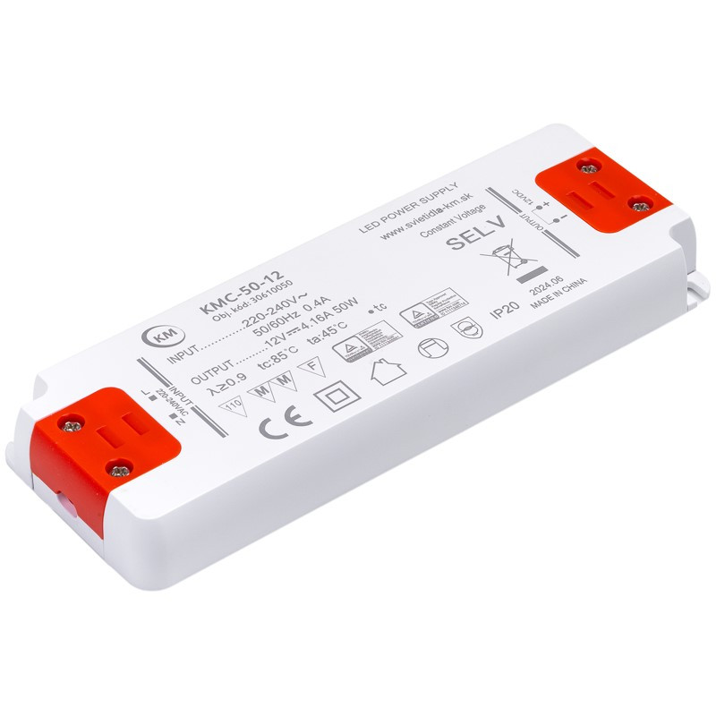 Napájací zdroj 30610050 KMC-50-12, s výkonom 50W, konštantným výstupným napätím 12V v krytí IP20.