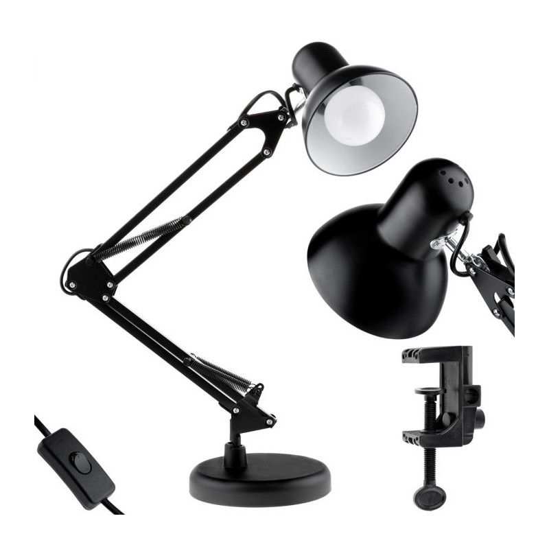 Stolíková lampa na písací stôl TOBI E27 čierna + stolný držiak Stolná lampa na písací stôl TOBI v čiernej farbe je kombináciou moderného štýlu a klasickej ergonómie. Vďaka priloženému držiaku ju môžeme priskrutkovať na hranu pracovnej dosky rôznych hrúbok a súčasťou je aj klasická podstava, vďaka ktorej je možné svietidlo umiestniť kamkoľvek. Vďaka ohybnému, pohyblivému ramenu tejto stolnej lampy, ktorým je možné nastaviť ľubovoľný uhol sklonu, vieme nastaviť uhol dopadajúceho svetla, čo nám umožní lepšie osvetliť pracovisko pri stole. Stolná lampa TOBI je vybavená klasickým závitom E27 , ktorý umožňuje inštaláciu najobľúbenejších žiaroviek rôznych farieb. Svietidlo je napájané sieťovým napätím 230V a má vypínač n