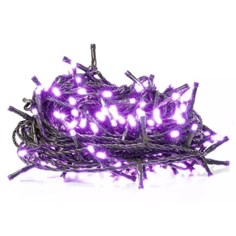 Vianočná reťaz 10-14-LED-M PU 10m s dĺžkou 10m+5m napájací kábel vo farebnom prevedení zelená, obsahuje 100ks LED vo farbe svetla purpurová,určená pre dekoračné osvetlenie interiérov aj exteriérov s krytím IP44 , timerom pre nastavenie zapnutia/vypnutia a napájacím napätím 220-240V.