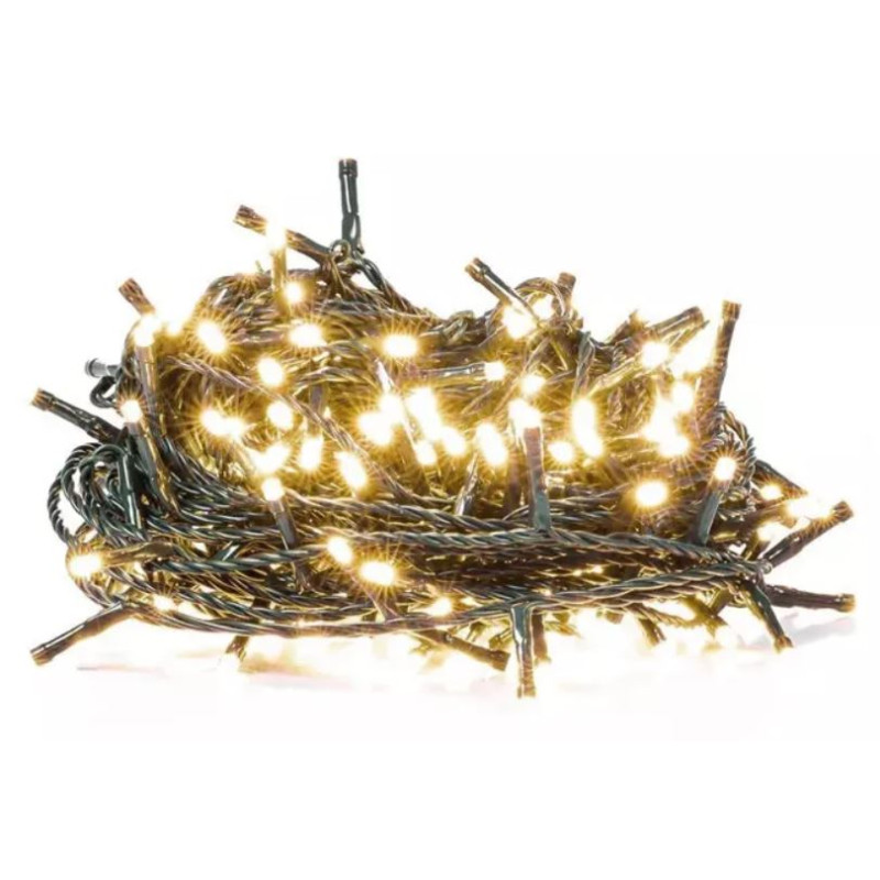 Vianočná reťaz 309-20-LED WW 7M s dĺžkou 7m+1,5m napájací kábel vo farebnom prevedení zelená, obsahuje 100ks LED vo farbe svetla teplá biela, určená pre dekoračné osvetlenie interiérov aj exteriérov s krytím IP44 a napájacím napätím 220-240V. Reťaz má prepojovací konektor ktorý umožňuje spájanie viacerých reťazí dohromady.