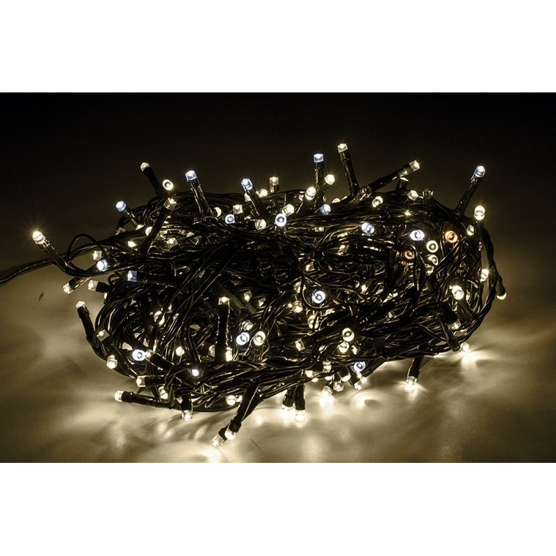 Vianočná reťaz 21-14-LED WW 10m s dĺžkou 10m+1,5m napájací kábel vo farebnom prevedení čierna, obsahuje 200ks LED vo farbe svetla teplá biela, určená pre dekoračné osvetlenie interiérov aj exteriérov s krytím IP44 a napájacím napätím 220-240V.