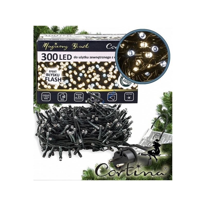 Vianočná reťaz 3-17-FLE WW+CW 15M s dĺžkou 15m+1,5m napájací kábel vo farebnom prevedení zelená, obsahuje 300ks LED vo farbe svetla teplá biela s efektom FLASH preblikávania studenej bielej, určená pre dekoračné osvetlenie interiérov aj exteriérov s krytím IP44 a napájacím napätím 220-240V.