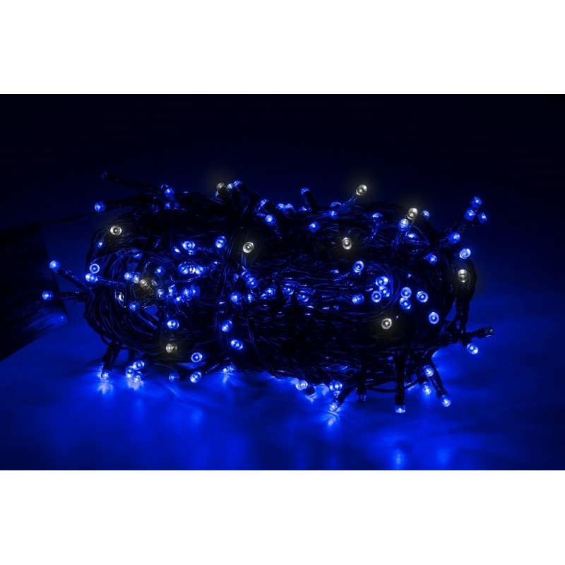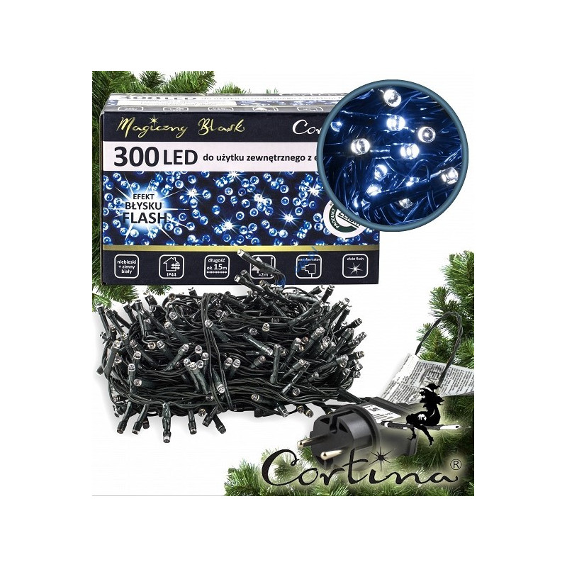 Vianočná reťaz 3-17-FLE WW+CW 15M s dĺžkou 15m+1,5m napájací kábel vo farebnom prevedení zelená, obsahuje 300ks LED vo farbe svetla modrá s efektom FLASH preblikávania studenej bielej, určená pre dekoračné osvetlenie interiérov aj exteriérov s krytím IP44 a napájacím napätím 220-240V.