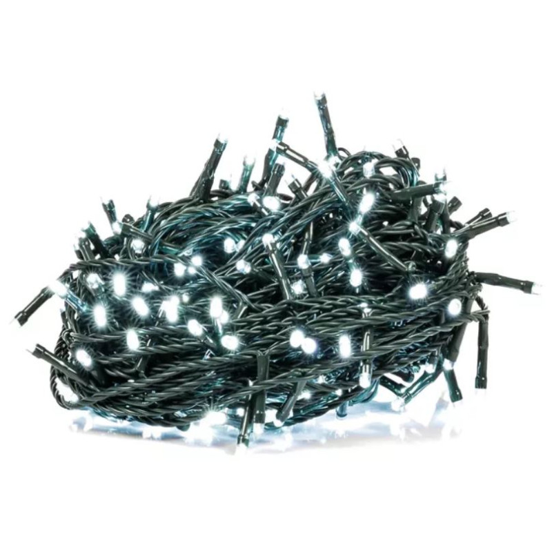 Vianočná reťaz 309-20-LED CW 7M s dĺžkou 7m+1,5m napájací kábel vo farebnom prevedení zelená, obsahuje 100ks LED vo farbe svetla studená biela, určená pre dekoračné osvetlenie interiérov aj exteriérov s krytím IP44 a napájacím napätím 220-240V. Reťaz má prepojovací konektor ktorý umožňuje spájanie viacerých reťazí dohromady.