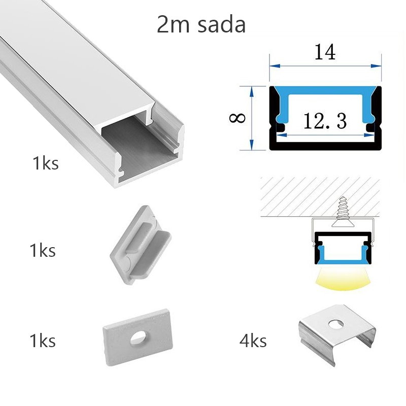 Sada lišty pre LED pásy KM35-S-MK-P 2m v striebornom farebnom prevedení určená pre prisadenú montáž o rozmeroch 14x8x2000mm. Balenie obsahuje: 1ks hliníkovej lišty s dĺžkou 2m, 1ks matný difúzor s dĺžkou 2m, 1ks koncovky bez otvoru, 1ks koncovky s otvorom, 4ks príchytky.