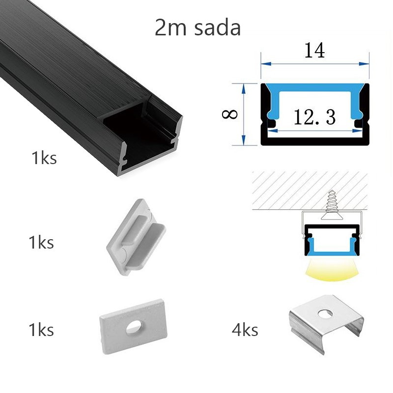 Sada lišty pre LED pásy KM35-C-MK-P 2m v čiernom farebnom prevedení určená pre prisadenú montáž o rozmeroch 14x8x2000mm. Balenie obsahuje: 1ks hliníkovej lišty s dĺžkou 2m, 1ks matný difúzor s dĺžkou 2m, 1ks koncovky bez otvoru, 1ks koncovky s otvorom, 4ks príchytky.