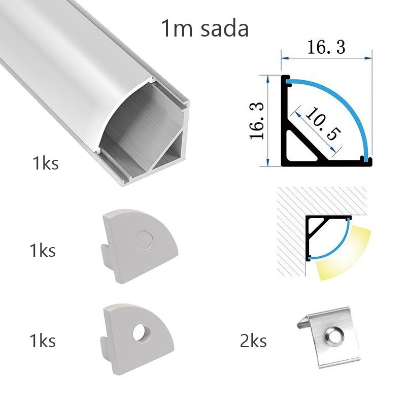 Sada lišty pre LED pásy KM55-S-MK-P 1m v striebornom farebnom prevedení určená pre rohovú montáž o rozmeroch 16x16x1000mm. Balenie obsahuje: 1ks hliníkovej lišty s dĺžkou 1m, 1ks matný difúzor s dĺžkou 1m, 1ks koncovky bez otvoru, 1ks koncovky s otvorom, 2ks príchytky.