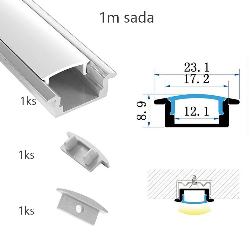 Sada lišty pre LED pásy KM39-S-MK-P 1m v striebornom farebnom prevedení určená pre zápustnú montáž o rozmeroch 23x9x1000mm. Balenie obsahuje: 1ks hliníkovej lišty s dĺžkou 1m, 1ks matný difúzor s dĺžkou 1m, 1ks koncovky bez otvoru, 1ks koncovky s otvorom.