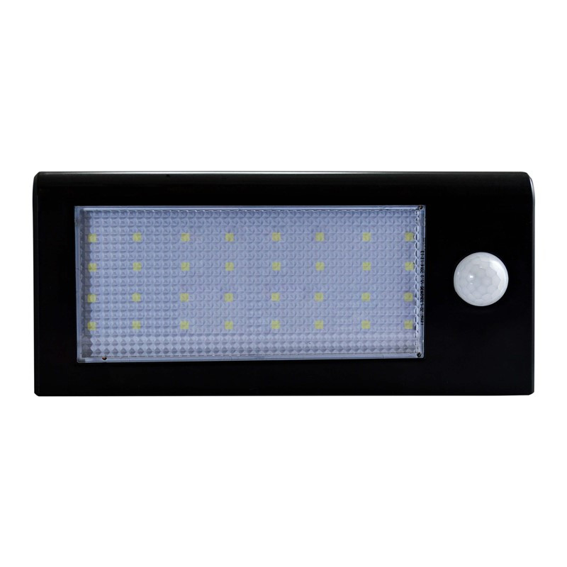 Solárne svietidlo BOX SRQ60401 so senzorom pohybu-súmraku v čiernom farebnom prevedení a studenou farbou svetla 6400K, pre použitie v exteriéri.