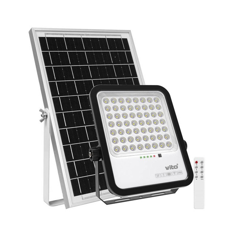 SAHARA-250W 6000K je solárny vodotesný reflektor IP65 vybavený SMD LED diódami a fotosenzorom. Priehľadný difúzor. Telo z ABS v čiernej farbe, polykarbonátový solárny panel a sklo. Monokryštalický panel 5V - 10W. Batéria: Lítiová 2xLiFePO4 3,2V 20000mAh, Životné cykly > 1200, Doba nabíjania: 6-8h Autonómia: 12-14h Je vybavená diaľkovým ovládačom s nasledujúcimi funkciami: ON - svietivosť 100%, svetlo zhasne po 12 -14 hodín. OFF - Svetlo vypnuté. Vysoká svietivosť - Tlačidlo je účinné, keď je svetlo zapnuté, svietivosť sa nastaví na 165 % a svetlo zhasne po 3 hodinách. Mierna svietivosť - Tlačidlo je účinné, keď je svetlo zapnuté, svietivosť sa nastaví na 35% a svetlo zhasne po 12-14 hodinách. 2H - Udržujte svietivosť na 165%, svetlo sa vypne po 2 hodinách. 4H - Svietivosť sa nastaví na 100 %, svetlo sa vypne po 4 hodinách. 6H - Svietivosť sa nastaví na 100 %, svetlo sa vypne po 6 hodinách. AUTO - Svietivosť sa nastaví na 100%, svetlo sa vypne po 12-14 hodinách.