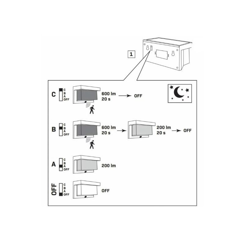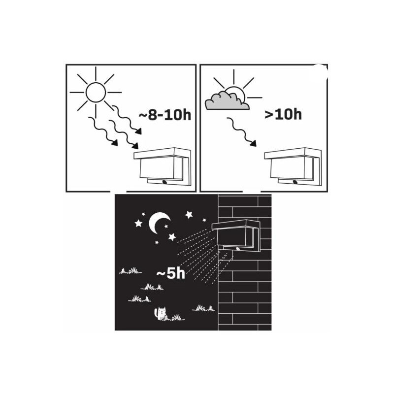 Solárne lampy zároveň zdobia záhradu a znižujú účty za elektrinu. Vďaka špeciálnej intenzite svetla sa používajú ako dekoratívne osvetlenie. Solárne nástenné svietidlo TONY je možné použiť na terasu alebo pred vchodové dvere. Cez deň sa solárna lampa nabíja na slnku a večer uvoľňuje nahromadenú energiu vo forme svetla. Ďalšie informácie: Mechanický vypínač ON/OFF, Zabudovaný súmrakový senzor - automaticky zapne lampu pri súmraku, Doba svietenia po úplnom nabití batérie: max 5 hodín (merané v lete, batéria nabitá za slnečného počasia cez deň), Svietidlo je vybavené PIR snímačom a pohybu súmraku, Uhol detekcie pohybu 120°, Rozsah detekcie pohybu od 3 do 5 m, Svietidlo má 4 režimy, 5 úrovní nastavenia solárneho panelu, Optimálny uhol solárneho panelu je 45° Maximálna konštantná doba svietenia so svietivosťou 200lm