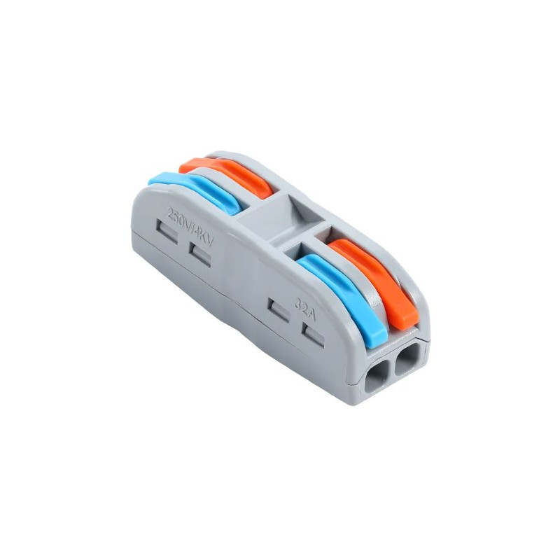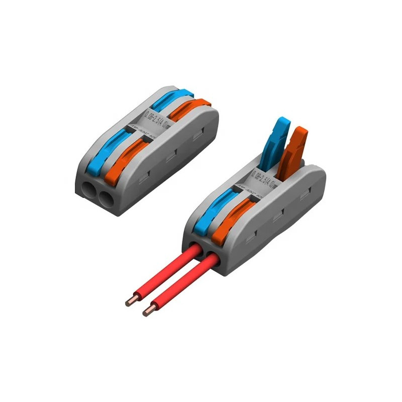 Svorka bezskrutková KM-2P-D-02, obj. kód 73000030, ktorá je určená pre spojenie dvoch dvojžilových vodičov nasunutím a zacvaknutím.