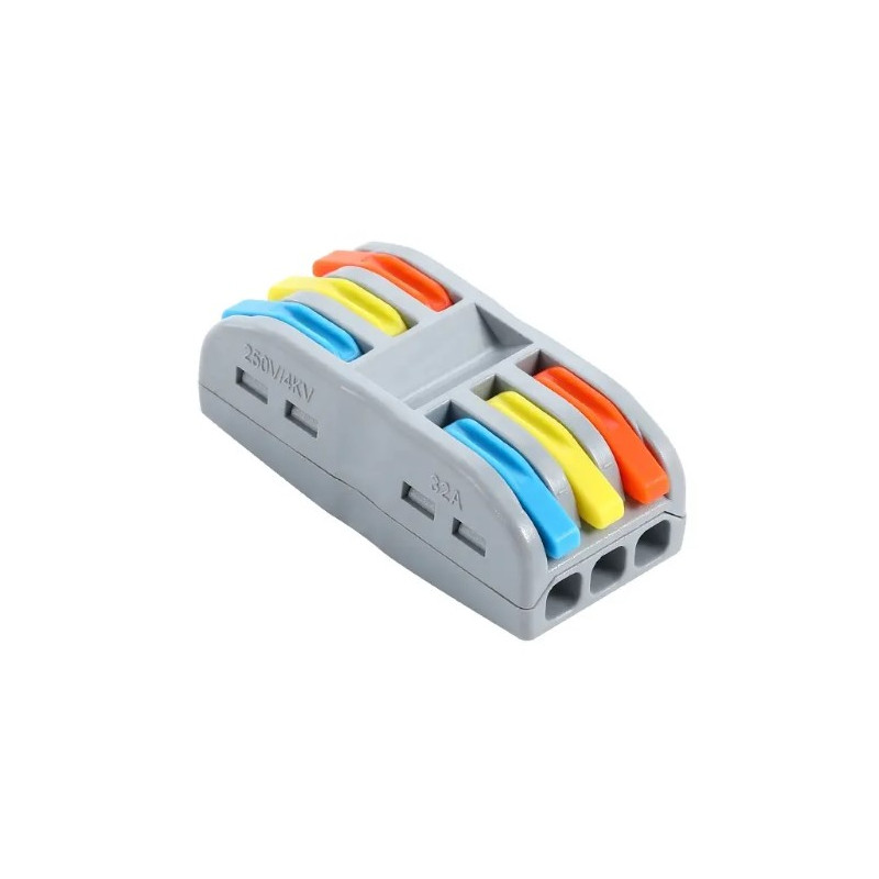 Svorka bezskrutková KM-3D-V-01, obj. kód 73000053, ktorá je určená pre spojenie troch vodičov nasunutím a zacvaknutím.