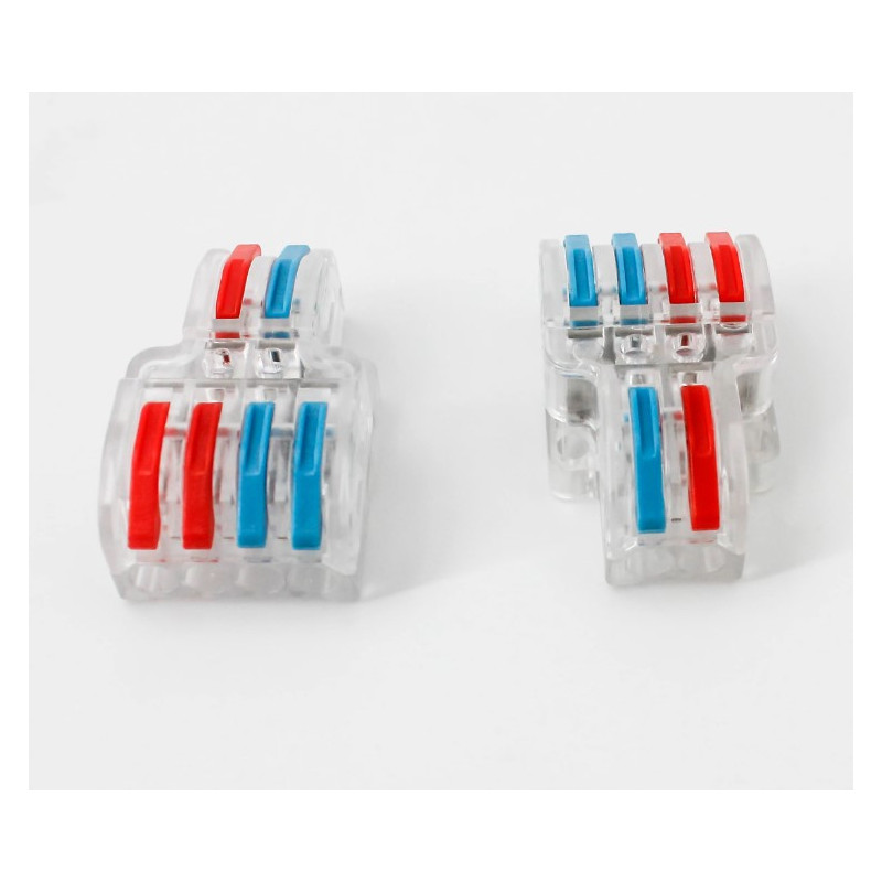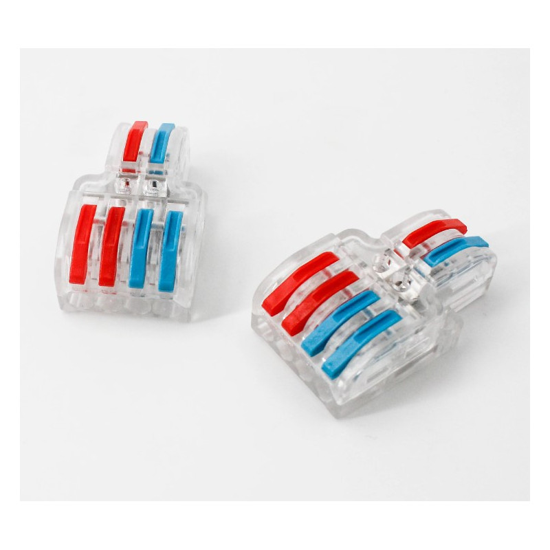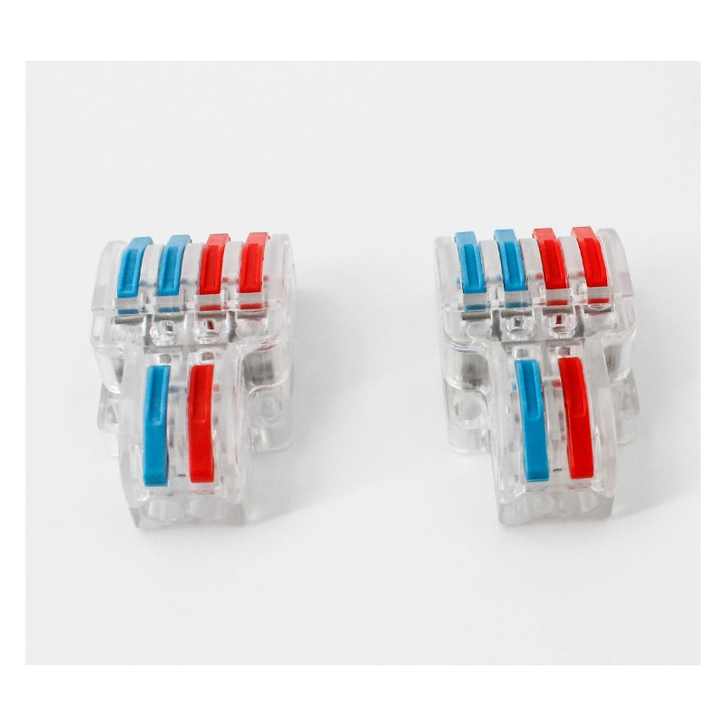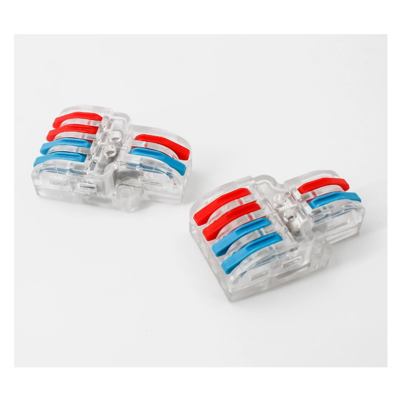 Svorka bezskrutková KM-2Px2-D-02, obj. kód 73000040, ktorá je určená pre spojenie troch dvojžilových vodičov nasunutím a zacvaknutím.
