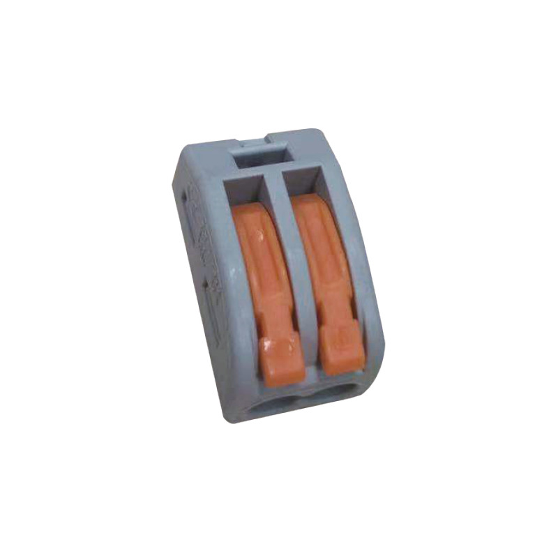 Svorka bezskrutková KM-2D-V-02, obj. kód 73000060, ktorá je určená pre spojenie dvoch vodičov nasunutím a zacvaknutím.