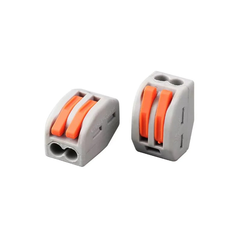 Svorka bezskrutková KM-2P-D-02, obj. kód 73000030, ktorá je určená pre spojenie dvoch dvojžilových vodičov nasunutím a zacvaknutím.