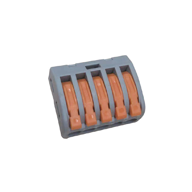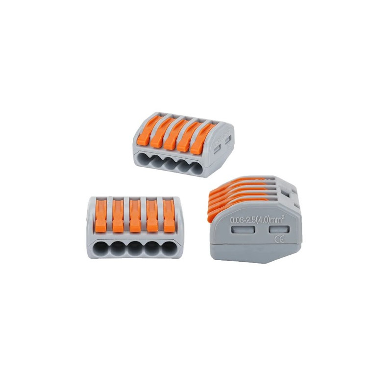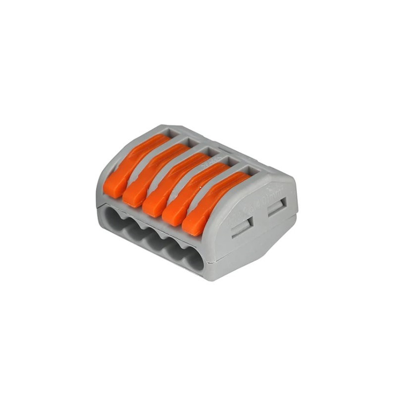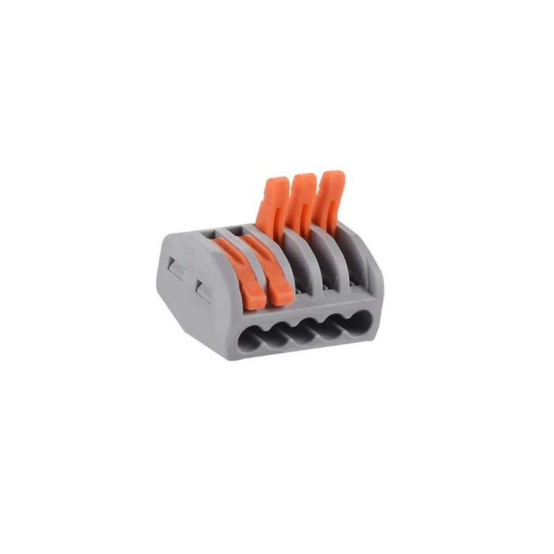 Svorka bezskrutková KM-5D-V-01, obj. kód 73000055, ktorá je určená pre spojenie piatich vodičov nasunutím a zacvaknutím.