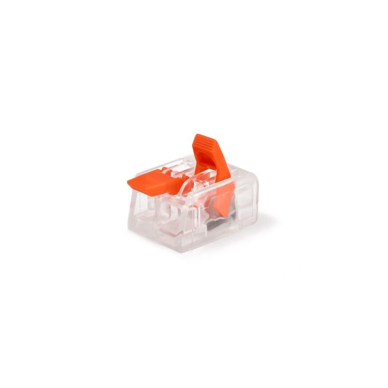 Svorka bezskrutková KM-2P-D-02, obj. kód 73000030, ktorá je určená pre spojenie dvoch dvojžilových vodičov nasunutím a zacvaknutím.