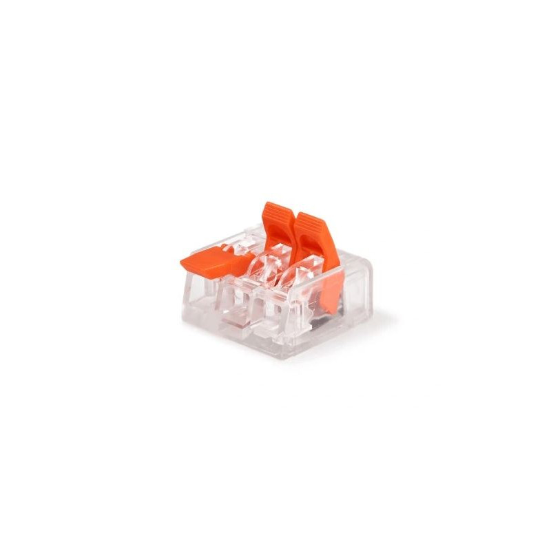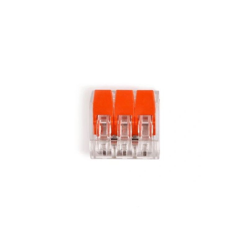 Svorka bezskrutková KM-3D-V-01, obj. kód 73000053, ktorá je určená pre spojenie troch vodičov nasunutím a zacvaknutím.
