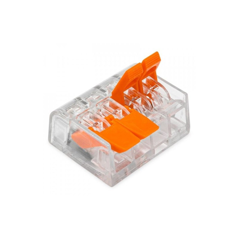 Svorka bezskrutková KM-2P-D-02, obj. kód 73000030, ktorá je určená pre spojenie dvoch dvojžilových vodičov nasunutím a zacvaknutím.