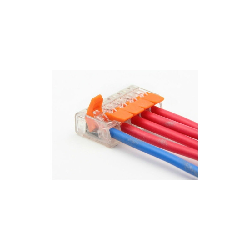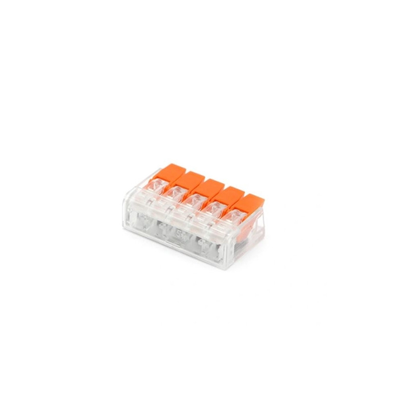 Svorka bezskrutková KM-5D-V-01, obj. kód 73000055, ktorá je určená pre spojenie piatich vodičov nasunutím a zacvaknutím.