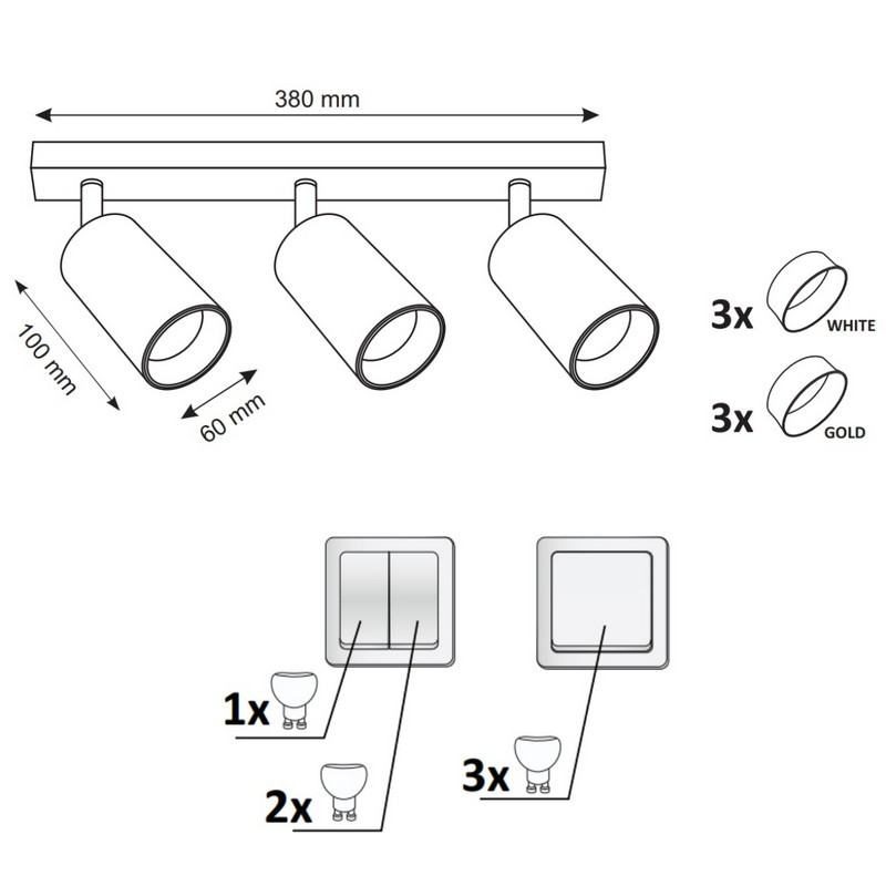MARIBEL je trojbodové, moderné svietidlo s vymeniteľným zdrojom svetla, vyrobené z bieleho hliníka. Osadenie má šesť obrúčok - tri biele, tri zlaté. Priložené hmoždinky a skrutky na montáž svietidla sú určené na pevné povrchy (betón, plná tehla). Na pripevnenie svietidla vždy používajte upevňovacie prvky, ktoré sú vhodné pre steny vo vašej domácnosti. Doplňujúce informácie: Svietidlo sa predáva bez svetelného zdroja. Sada obsahuje: osadenie + 6 prsteňov (3 biele, 3 zlaté)