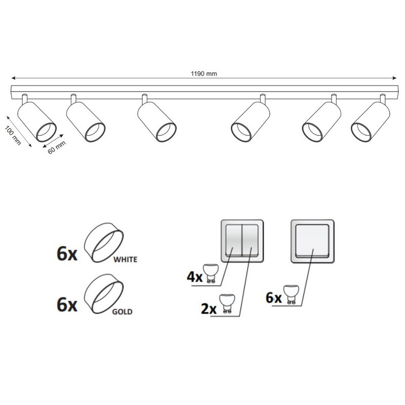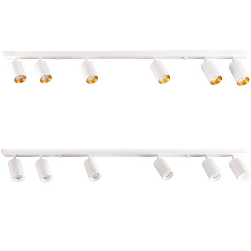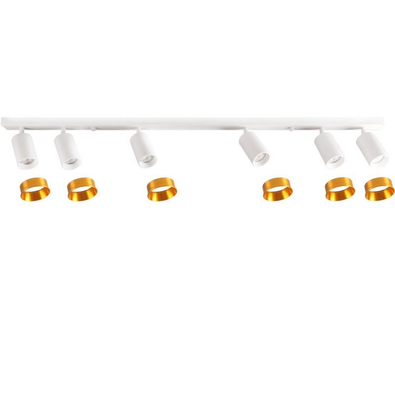 MARIBEL je šesť svietidlo, moderné svietidlo, bodové s vymeniteľným zdrojom svetla, vyrobené z bieleho hliníka. Osadenie má dvanásť prsteňov - šesť v bielej farbe, šesť v zlate. Priložené hmoždinky a skrutky na montáž svietidla sú určené na pevné povrchy (betón, plná tehla). Na pripevnenie svietidla vždy používajte upevňovacie prvky, ktoré sú vhodné pre steny vo vašej domácnosti. Doplňujúce informácie: Svietidlo sa predáva bez svetelného zdroja. Sada obsahuje: osadenie + 12 prsteňov (6 bielych, 6 zlatých)