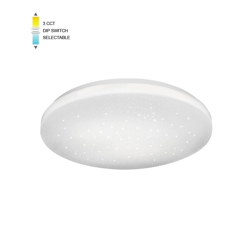 Svietidlo COSMOS-R 24W LED CCT o rozmeroch D350x55mm v bielom farebnom prevedení s nastaviteľnou farbou svetla 3000K-4000K-6500K, s efektom hviezdné nebo, určené pre osvetlenie interiérov.